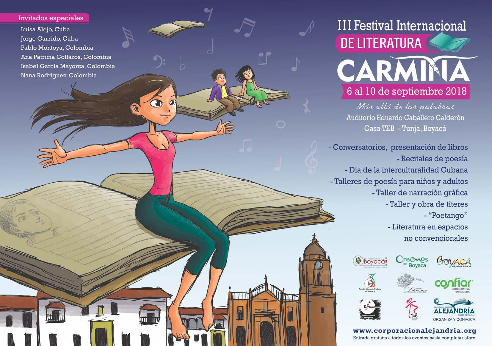 III Festival Internacional de Literatura Carmina 2017. En la tercera versión se logró llegar a 4.700 personas asistentes a las actividades realizadas tanto en espacios no convencionales como en los auditorios. Durante los días jueves 6, viernes 7 y sábado 8, domingo 9 y lunes 10 de septiembre se realizó la tercera versión del Festival Internacional de Literatura Carmina, en la ciudad de Tunja con asistencia a todos los eventos. Se realizaron talleres para niños tanto en poesía como en creación de narración a través de las imágenes, así como taller y presentación de una obra de títeres para los niños, en la Casa Teb, también durante los tres días hubo talleres para adultos, tanto de poesía así como la realización de tertulias en las que se compartieron textos de los asistentes. Se desarrolló una actividad al aire libre, con la creación de la Biblioteca Itinerante Alejandría, en la que se leyeron textos y se compartieron con los transeúntes, el día domingo se hizo también la actividad en el parque Biblioteca con la Biblioteca itinerante para animación a la lectura, la cual tuvo una gran acogida por parte de las familias participantes. En horas de la tarde, se realizaron un total de 3 presentaciones de libros de autores tanto regionales como nacionales y uno internacional, 5 conversatorios, uno con invitados de Cuba, así como 1 lectura de poemas en auditorio, una lectura de poemas en espacios no convencionales, con la intervención de tres poetas regionales, en el Paredón de los Mártires, Presentación de POETANGO, con la escritora y cantora Patricia Collazos y el grupo de tango de la Milonga Municipal de Bogotá, en la cual se integró al público asistente. El escritor Pablo Montoya presentó su libro escuela de música, que la que la protagonista es la ciudad de Tunja y donde algunos de los personajes retratados en la novela, se hicieron presentes para participar en el conversatorio, Los escritores invitados conversaron con el público asistente y realizaron también una firma de libros. La apertura de estos nuevos espacios para la literatura fue uno de los mayores logros de esta versión del festival, así como el hecho de lograr una relación entre la música y la literatura a través de las actividades de Poetango y del libro La Escuela de Música. El III Festival Internacional de Literatura Carmina, contó con un total de 25 actividades para públicos de todas las edades y condiciones sociales.